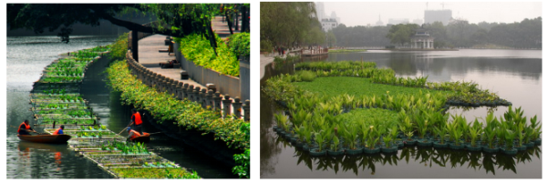 广泛应用于城市水体水质的长效保持,通过生态系统的恢复与系统构建,持续去除水体污染物,改善生态环境和景观。主要采用人工湿地、生态浮岛、水生植物种植等技术方法,利用土壤-微生物-植物生态系统有效去除水体中的有机物、氮、磷等污染物。综合考虑水质净化、景观提升与植物的气候适应性,尽量采用净化效果好的本地物种,并关注其在水体中的空间布局与搭配。