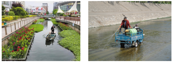 主要用于城市水体沿岸垃圾临时堆放点与水体水生植物和岸带植物的季节性收割、季节性落叶及水面漂浮物的清理。沿岸垃圾清理是污染控制的重要措施,其中垃圾临时堆放点的清理属于一次性工程措施,应一次清理到位。水生植物、岸带植物和落叶等属于季节性的水体内源污染物,需在干枯腐烂前清理,水面漂浮物主要包括各种落叶、塑料袋、其他生活垃圾等,需要长期清捞维护。